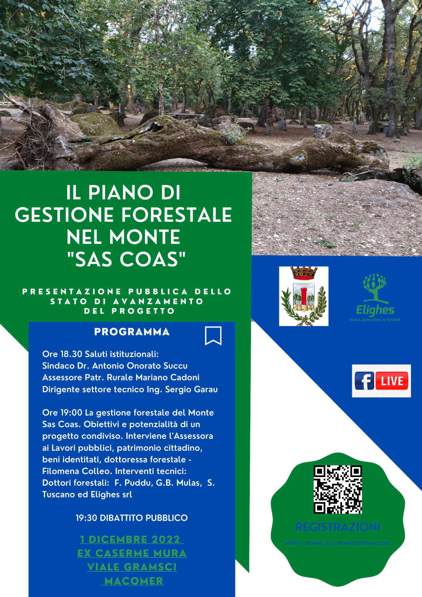 Si informano i cittadini che in data 01.12.2022, alle ore 18.30 presso il Padiglione Filigosa – ex Caserme Mura, in Viale Gramsci a Macomer. si terrà un incontro pubblico, nell’ambito del processo di progettazione partecipata per la predisposizione del Piano Forestale Particolareggiato (PFP) del Monte Sas Coas, nel Comune di Macomer, per presentazione dello stato dei lavori.