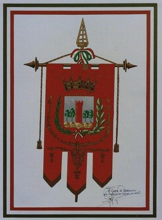 Ha la tradizionale forma di scudetto. Su sfondo in argento campeggia una torre rossa, con tre merli alla ghibellina, fondata sulla collina rocciosa al naturale, accostata da quattro alberi, due per parte, con la chioma verde, nodriti sulle quattro vette di uguali colline. Sormontato da una corona e con attorno i diademi intrecciati di alloro e quercia, simboli della Repubblica.